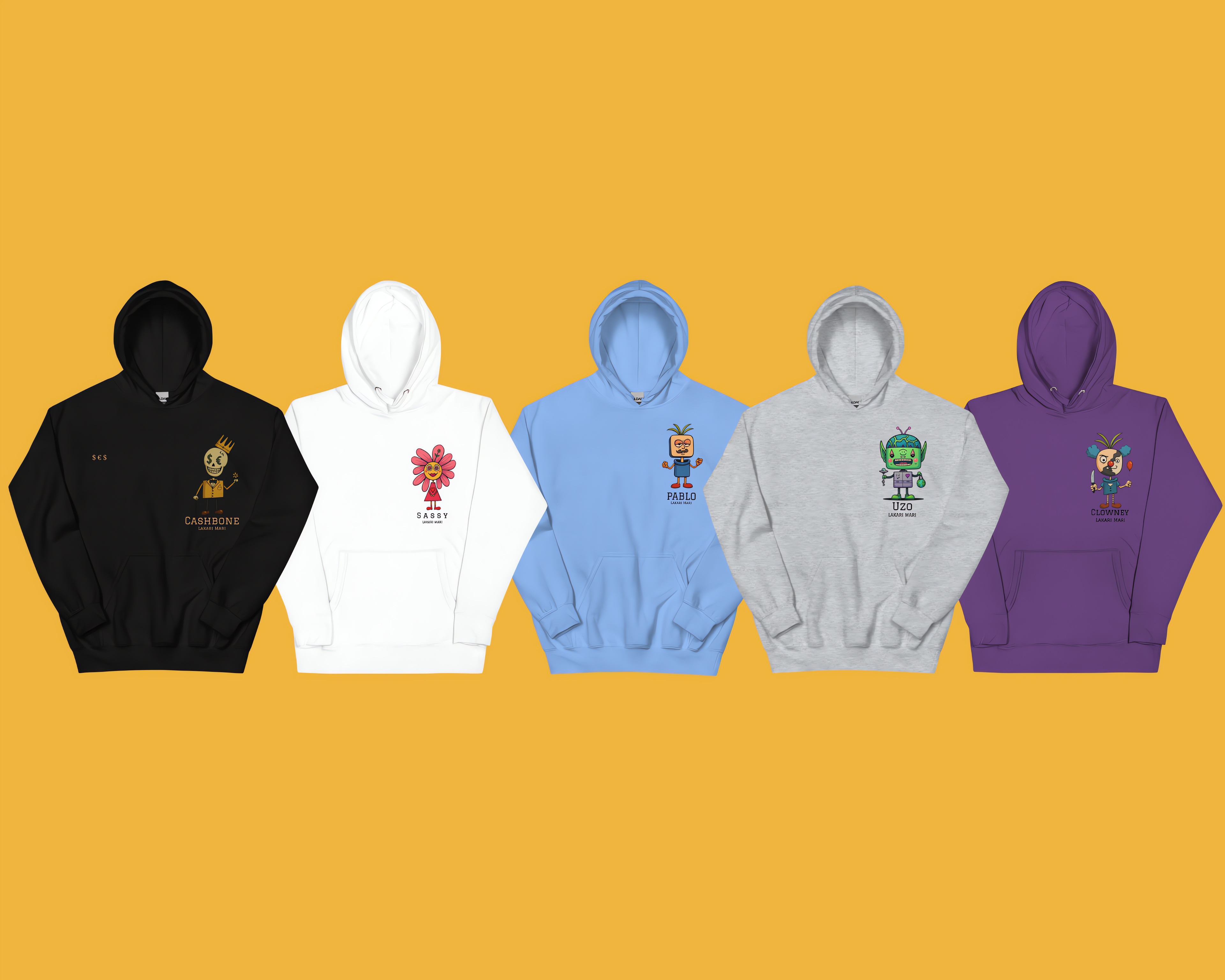 Cashbone, the King of Lakari Mari, is a treasure-hunting spirit whose eyes turned into $ and € after laughing at the stock market. With his spooky grin and love for bargains, he roams the world bringing luck, charm, and unexpected wealth to those he meets.